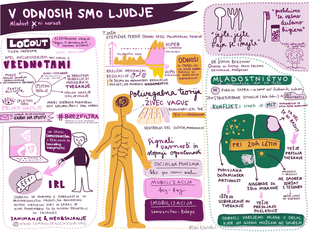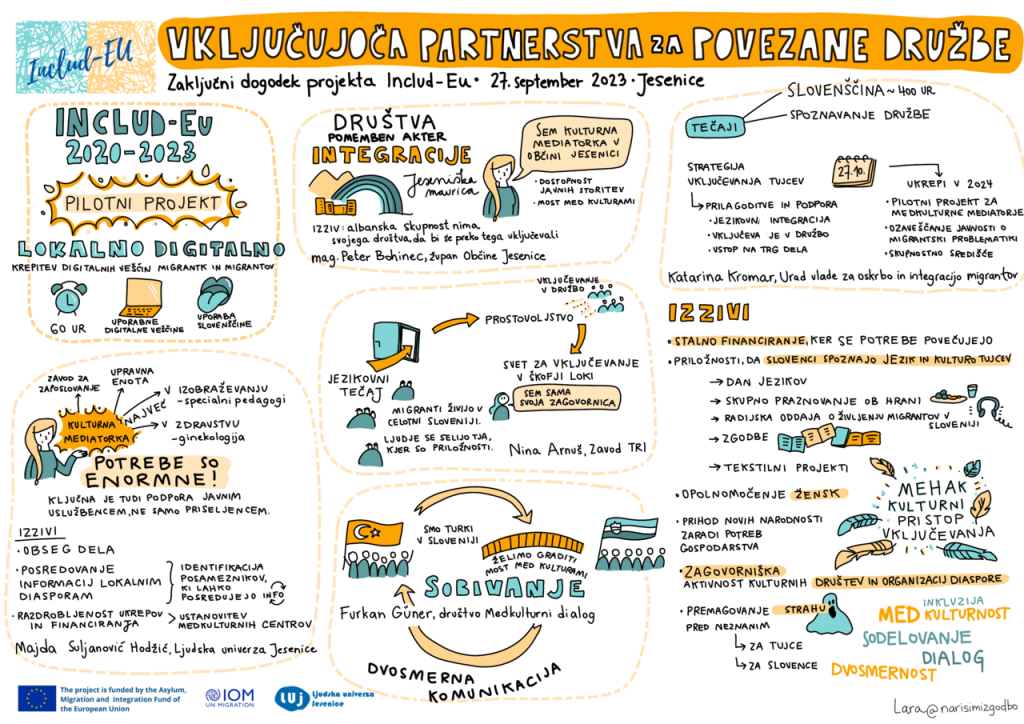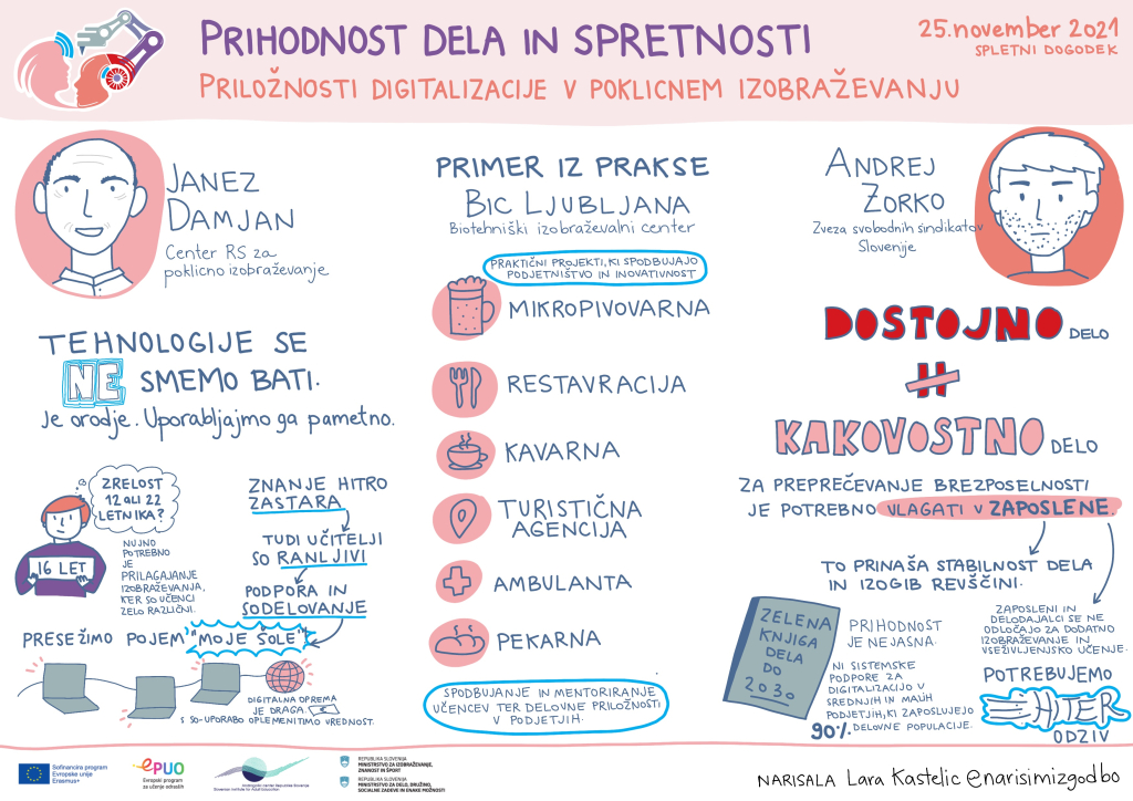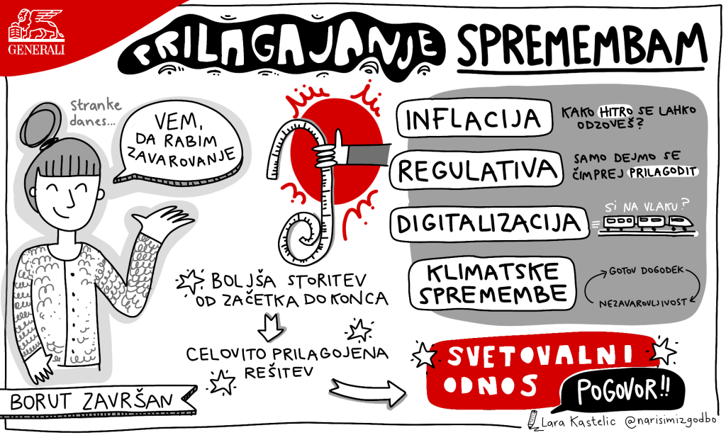 Larine ilustracije so ujele ključne trenutke celodnevne konference, kar predstavlja svež, interaktiven pristop k povzemanju vsebine. Lara je skozi ves dan sproti zajemala ključne poudarke in jih pretvorila v vizualne zgodbe. Prav posebno je spremljati, kako vsaka poteza nastaja pred našimi očmi in počasi sestavlja vizualno zgodbo dneva.